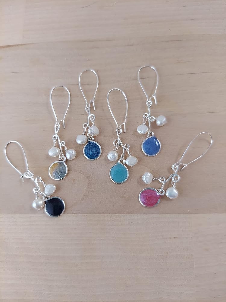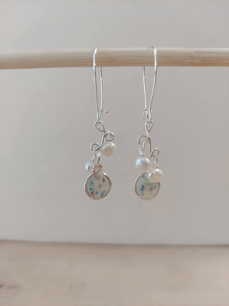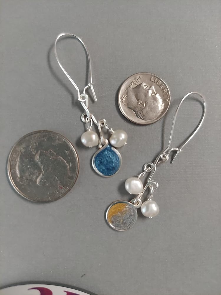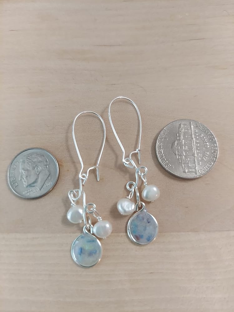 earrings are handmade from metallic denim resin and white freshwater pearls app 1.5 inches lightweight silvertone ear wires are nickel free foe sensitive ears made in the USA