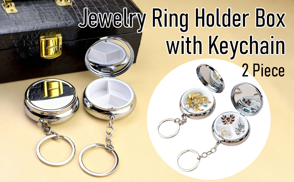 Jewelry Ring Holder Box with Keychain, Portable Travel Mini Jewelry Case for Women Girls Mothers, Small Versatile Ring Earring Stud Necklace Storage Case with Key Chain, 2 Piece Silver