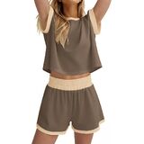 JEIBKOUY Women 2 Piece Short Set Summer Color Block Pajamas Short Sleeve T Shirts Shorts Casual Knit Lounge Sets