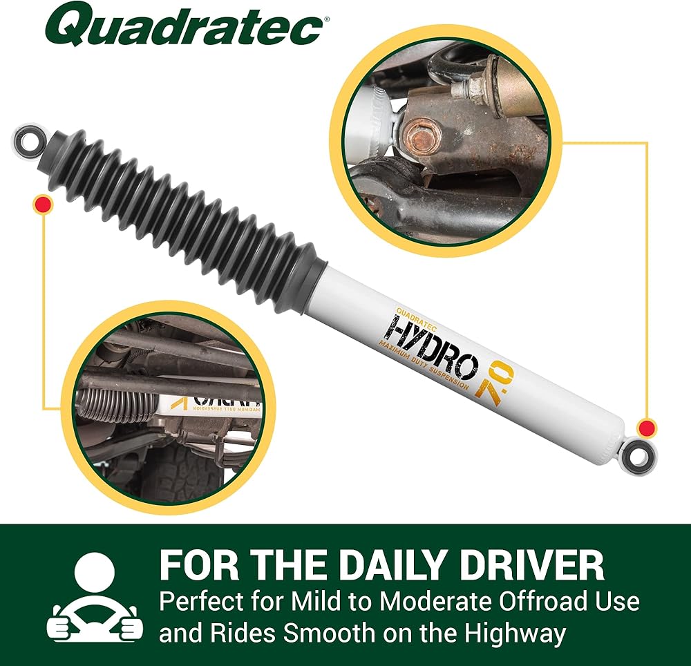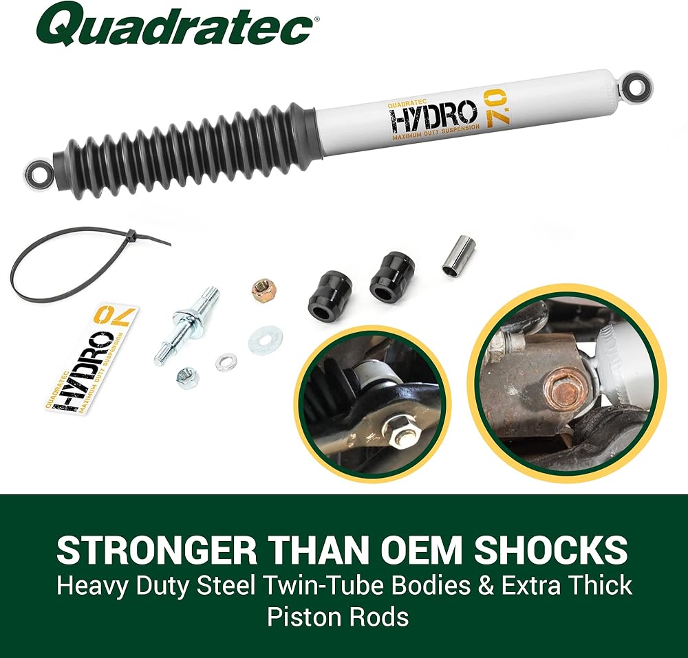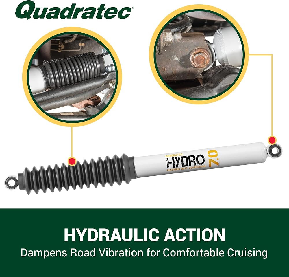 LASTING DURABILITY - Quadratec's Maximum Duty Hydro Shocks are engineered specifically for the year, make and model of your vehicle, featuring heavy duty polyurethane bushings and 14mm rods, with dust boots that protect them from dirt and debris