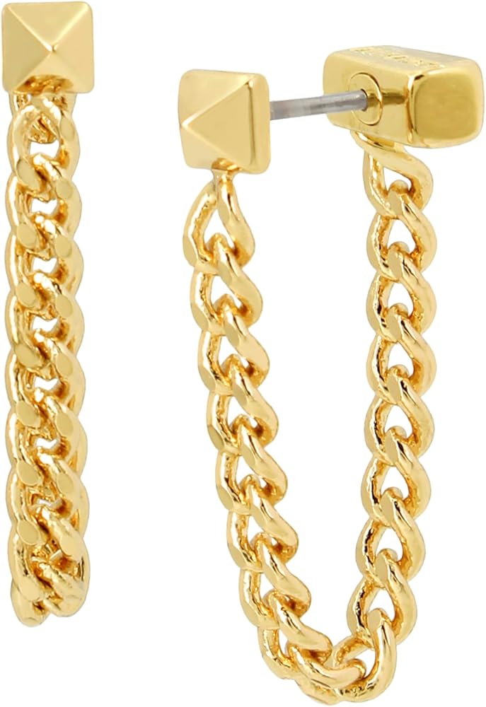 EDITOR'S NOTES : Everyday earrings featuring minimal pyramid stud paired with refined front to back swag chain.