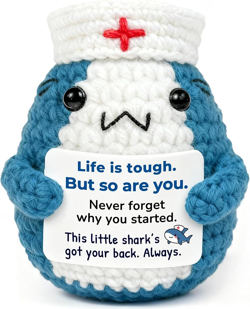 Adorable Shark with Removable Nurse Hat: A cute mini crochet shark wearing a removable nurse hat and holding a sweet “You're Fin-tastic” card—an uplifting, smile-making gift that instantly brightens any shift