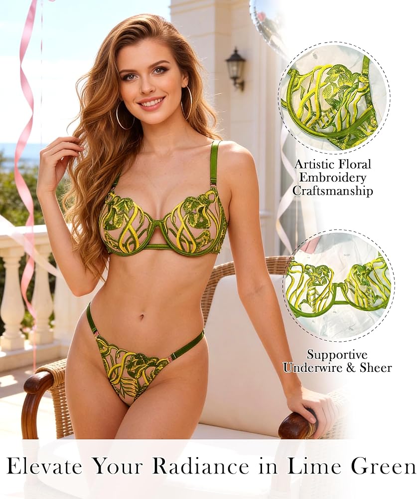Elevate Your Radiance in Lime Green: Stand out with this vibrant lime green lingerie set featuring intricate, high-contrast vine embroidery. The luminous color is designed to complement all skin tones, making it the perfect statement piece for a bold, refreshing look.