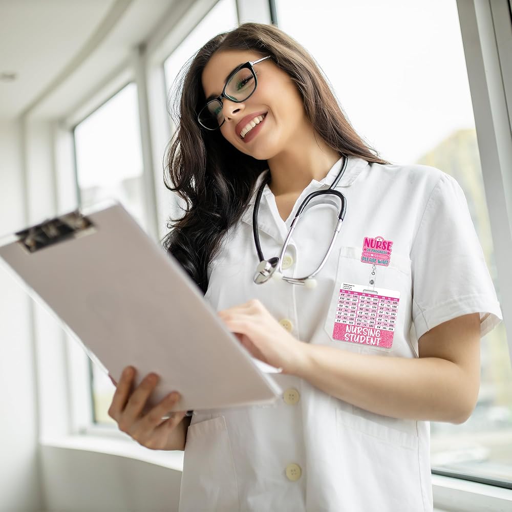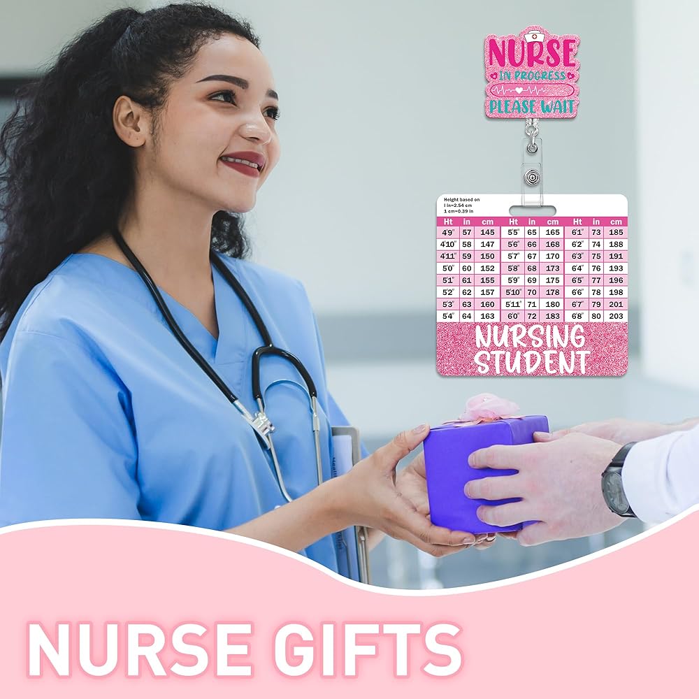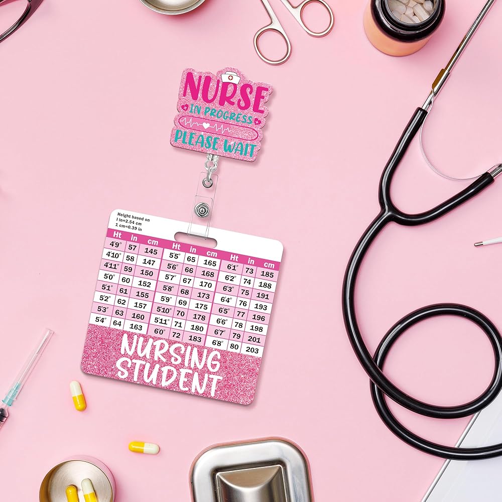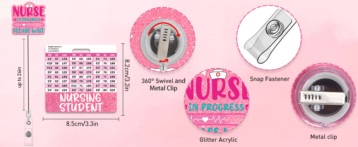 Nursing Student Badge Reel with Retractable Clip, Cute Student Nurse Badge with w/Height & Weight Conversion Charts, Glitter Nurse ID Badges Holder for Nursing School Students Essentials Gift