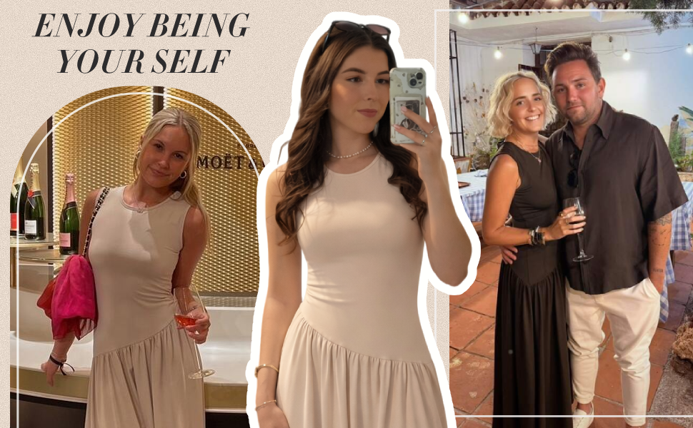 Design: Flattering slim fit top; classic round neck; sleeveless tank dress style for women; gathered detail at the drop waist; a line skirt silhouette; long flowy dress with an elegant flared hem; versatile plain pattern for effortless styling; simple yet elegant aesthetic.