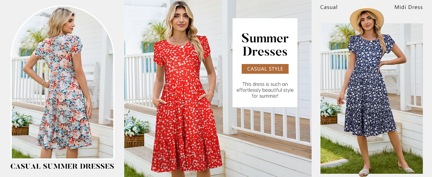 Highlights: This flowy midi dress with cute tiered skirt, flounces on the casual style and two handy side pockets, which are perfect match for this dress. A nice simply dress for summer! Modest crowneck and petal sleeve, The midi length with tiered design makes the summer dress less monotonous