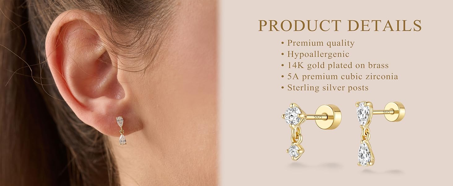 Double Stone Design: These dangle flat back earrings for women feature two 5A cubic zirconia stones arranged vertically to create a delicate focal point on the ear.