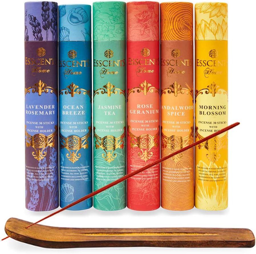 Essence incense gift pack 180 sticks with incense holder 6 flavors, Ocean, Morning Blosom, Jasmine tea, Rose Geranium, Sandalwood spice, and Lavender Rosemary.
