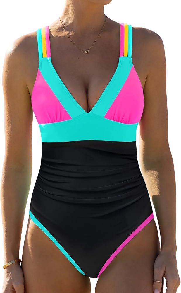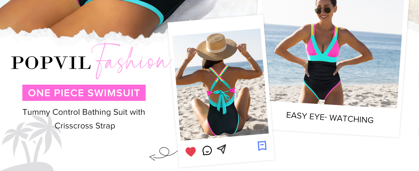 This women's one piece swimsuit is designed to combine modern style, flattering fit, and comfortable support for summer swimwear. The deep V neck design enhances the bust shape while creating a feminine and confident look that suits a variety of body types. Featuring an eye-catching color block pattern, this swimsuit visually shapes the body and adds a sporty yet stylish touch. The built-in tummy control panel smooths the midsection and supports the waist, helping create a slimming silhouette without feeling restrictive. The criss cross back design with adjustable tie closure allows for a customized and secure fit while highlighting an elegant open-back style. Soft, stretchy, and quick-drying fabric ensures comfort and flexibility, making it easy to move, swim, and relax throughout the day. Perfect for beach vacations, pool swimming, tropical trips, cruises, and resort wear, this one piece bathing suit is a versatile choice for women seeking both style and functionality in their swimwear.