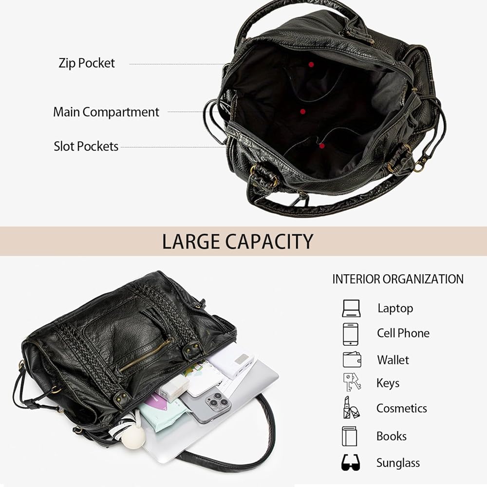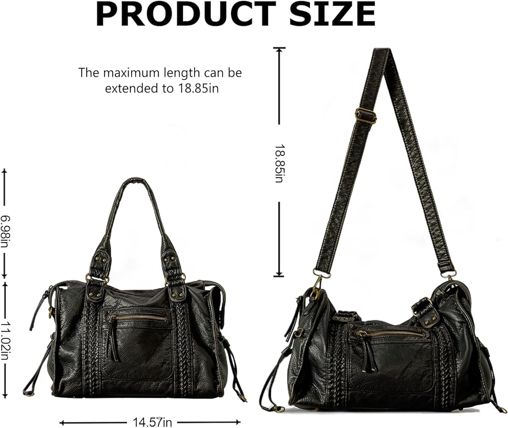 Large Capacity: Size:14.57”L x 4.72”W x 11.02”H. This is a large size slouchy bag for women, featuring one zippered pocket on the front/back, one internal zip pocket, 2 internal slot pockets.The main compartment easily fits a 14-inch laptop along with daily essentials like a phone, iPad, umbrella, lipstick, notebook, clothes, and water bottle.