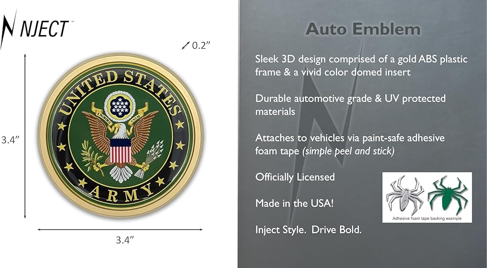 Support Our Troops with this Officially Licensed United States Army auto emblem (3.4” x 3.4” x 0.2") by NJECT. This sleek emblem is designed with a custom molded gold ABS plastic frame and vidid color domed 3D insert. Made in the USA, the durable automotive-grade, UV protected materials are constructed to last for years on your vehicle. Attaches via simple peel and stick, paint-safe adhesive foam tape. Our premium auto emblems are the perfect way to showcase your patriotism and military pride everywhere you drive. In addition, all NJECT auto emblems make a great gift. Our motto is "Inject Style, Drive Bold."