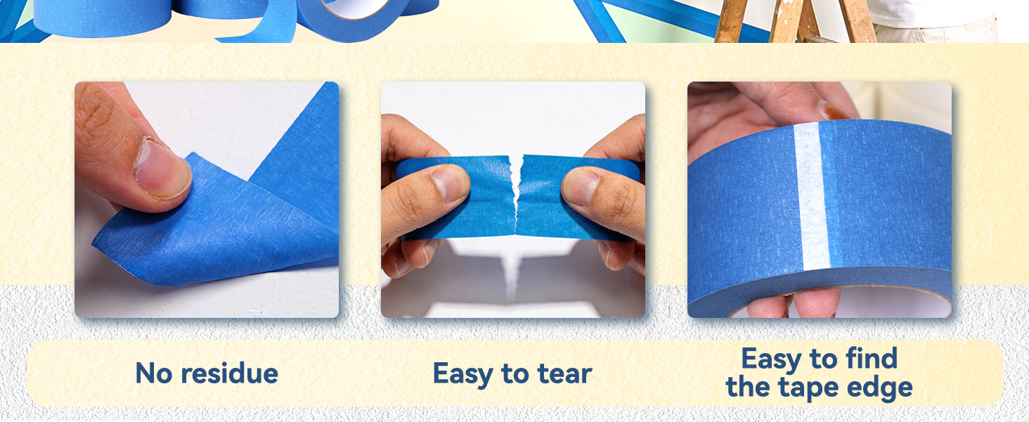 High Temperature & UV Resistant: This blue tape is designed to withstand temperatures up to 150°F (about 65°C) and is UV-resistant, ensuring it doesn't fade over time. The masking tape is suitable for both indoor and outdoor use.