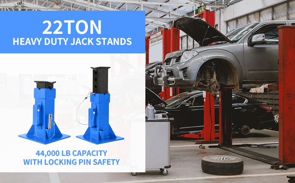 SERIOUS LIFTING POWER: Step up to professional-grade capability with these 22-ton jack stands, built to provide an unyielding foundation for your heaviest vehicles. The all-steel backbone is engineered to give you total peace of mind when working under large trucks, RVs, and agricultural equipment, ensuring uncompromising safety for the most demanding jobs.