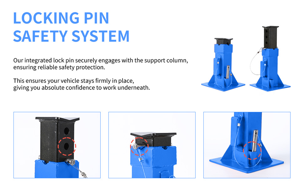 FAIL-SAFE LOCKING SYSTEM: This stand is designed with multiple layers of safety. The heavy-gauge steel locking pin provides a positive, immovable lock, while the deep-groove saddle bites firmly onto the vehicle's frame to prevent slipping. To complete the system, the wide-stance feet anchor the stand firmly to the ground, creating an incredibly stable and secure support structure.