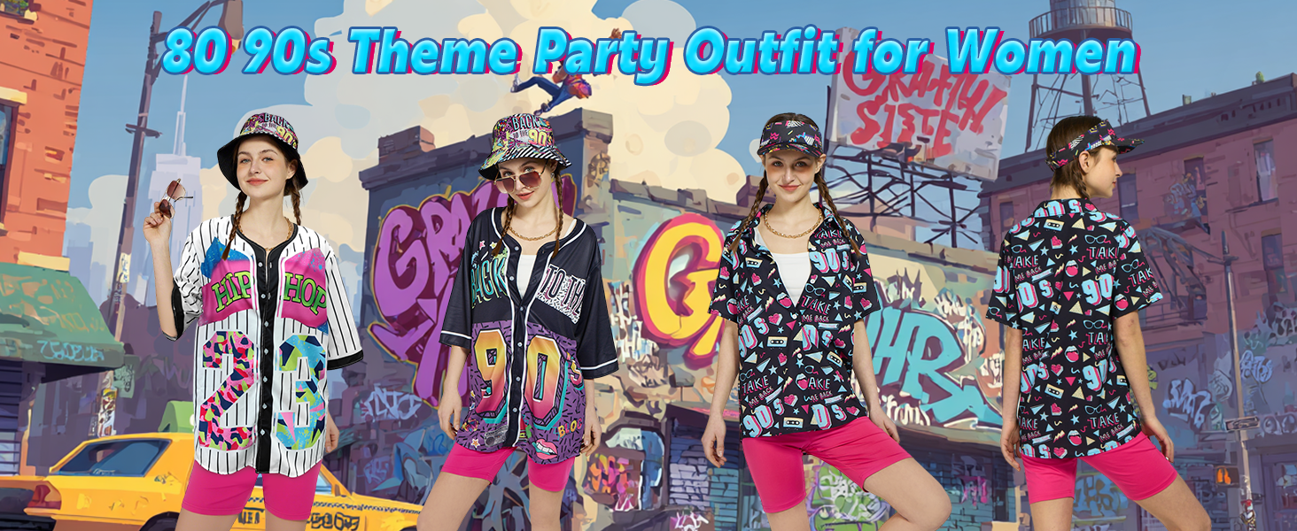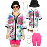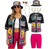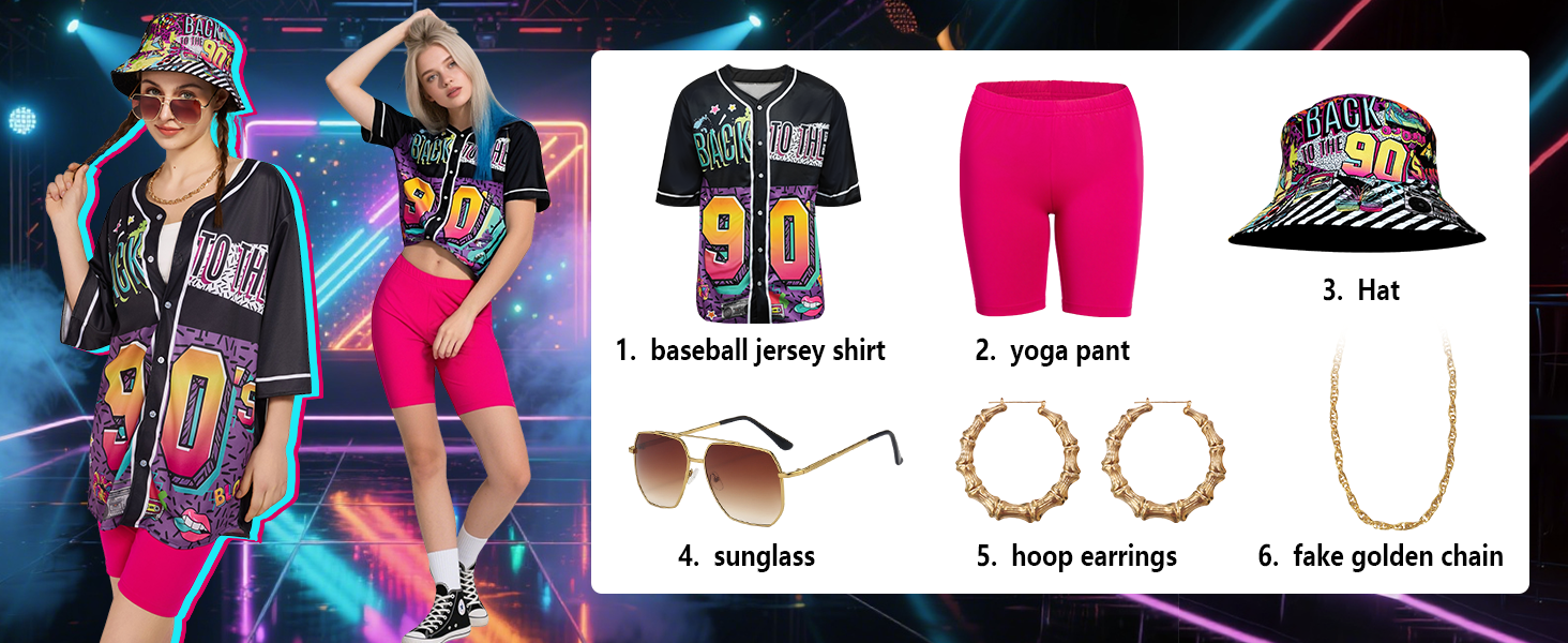 90s Outfit for Women:It includes everything you need—a 90s style baseball jersey, comfortable yoga pants, a classic visor hat, gold-tone accessories, and a practical fanny pack. Whether you're heading out for a fun day or hitting up a 90s themed party, this set has you covered.