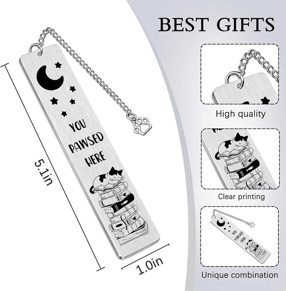Book Accessories for Reading Lovers:Cat themed gifts for women.This bookmark is perfect as a birthday gift,graduation gift,reading gift,Thanksgiving gift,Christmas gift,etc.for book and cat lovers.Tuck this bookmark into the spine of your favorite novel,textbook,or poetry collection,etc.The cat-on-books design and playful slogan make it a fitting way to honor any moment that calls for celebrating the joy of reading and feline companionship.