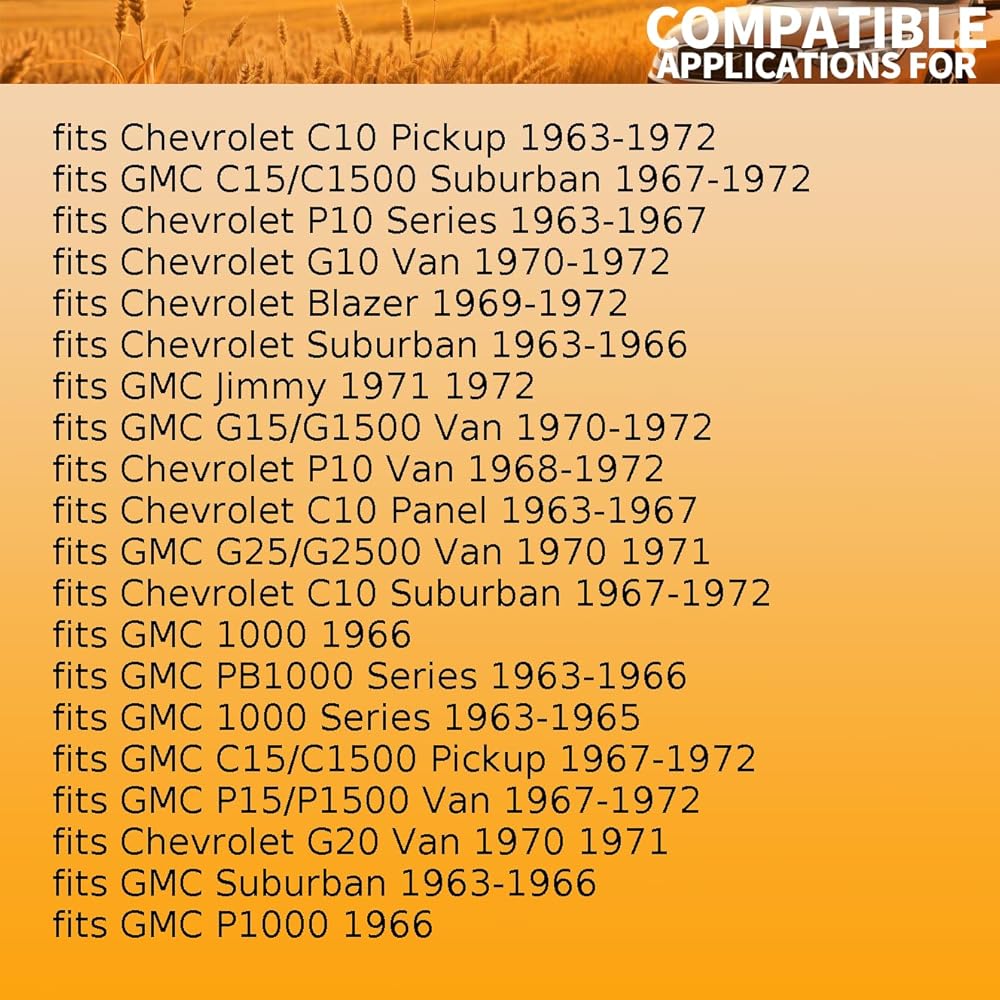 Fitment1: Suspension Control Arm Shaft Kit fits Chevrolet Blazer 1969-1972 fits Chevrolet C10 Panel 1963-1967 fits Chevrolet C10 Pickup 1963-1972 fits Chevrolet C10 Suburban 1967-1972 fits Chevrolet G10 Van 1970-1972 fits Chevrolet G20 Van 1970-1971 fits Chevrolet P10 Series 1963-1967 fits Chevrolet P10 Van 1968-1972 fits Chevrolet Suburban 1963-1966 fits GMC 1000 1966 fits GMC 1000 Series 1963-1965 fits GMC C15 C1500 Pickup 1967-1972