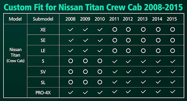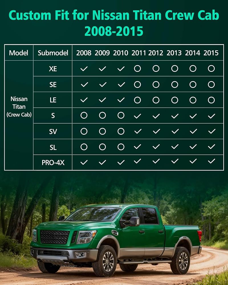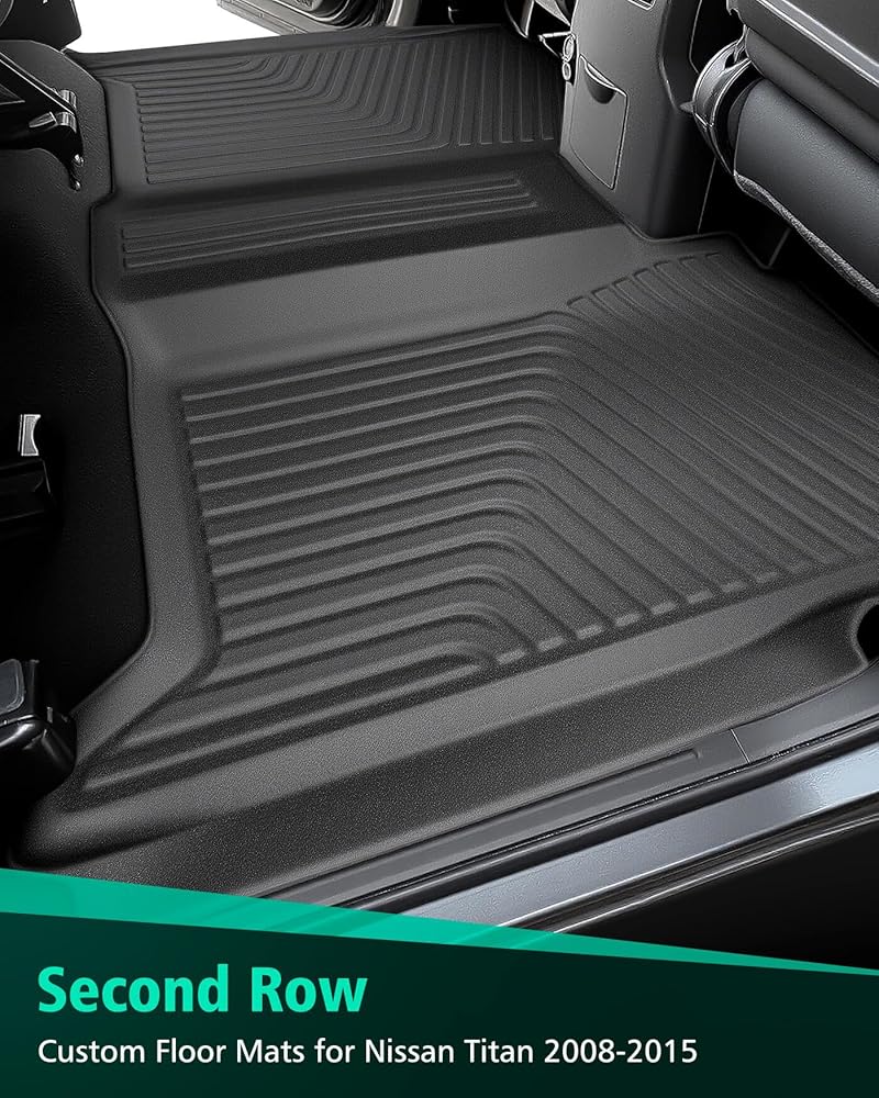 Custom Fit for Nissan Titan 2008-2015 Crew Cab (Not for King Cab): Designed specifically for Nissan Titan Crew Cab 2008 2009 2010 2011 2012 2013 2014 2015 pickup truck models. These car accessories for Nissan Titan 2015-2008 include driver, passenger, and second row mats. These rugs for Titan contour to the interior layout, offering full protection across all seating areas and maintaining a snug, stable fit