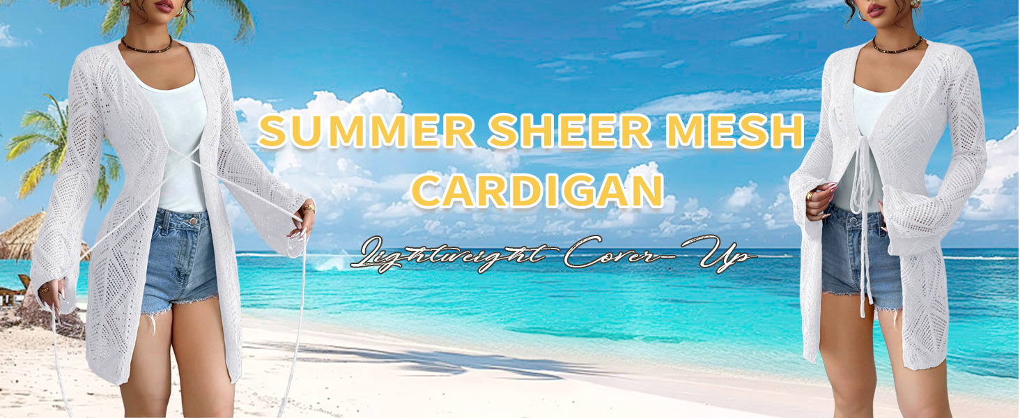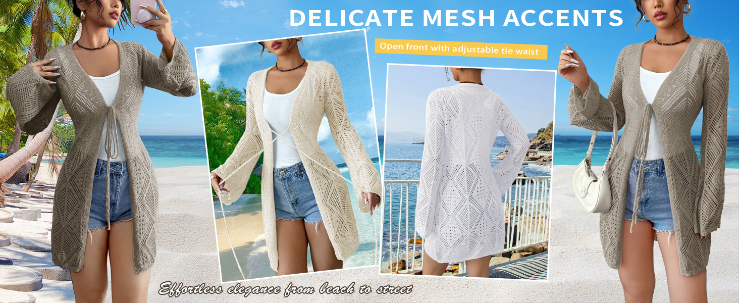Boho-Chic Design:✦ Open front with adjustable tie waist ✦ Delicate mesh accents ✦ Ribbed hem detailing.Vintage-inspired silhouette creates effortless elegance from beach to street.