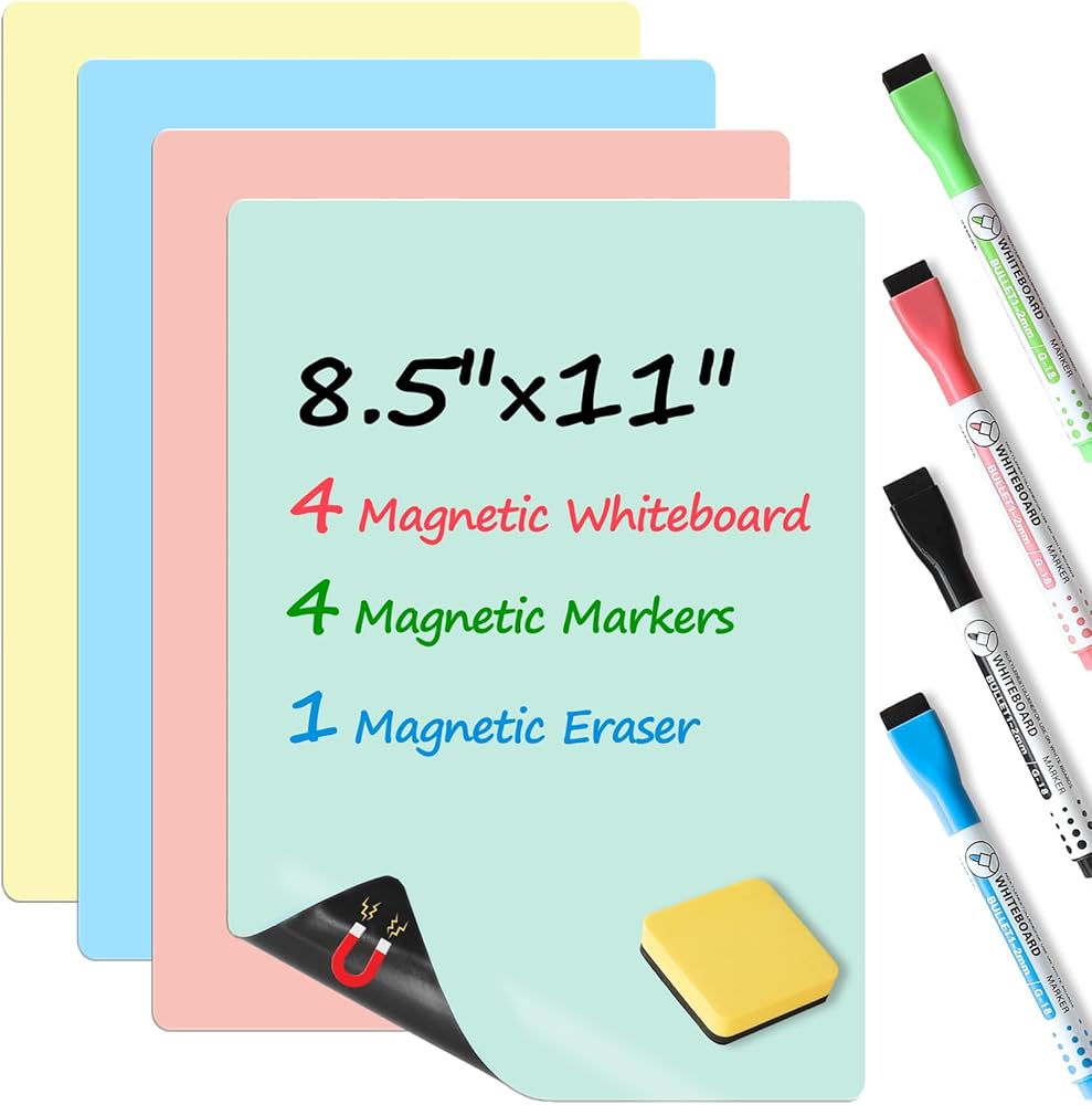 MAXECHO Magnetic Dry Erase Board Sheets, 4 Colors White Board for Fridge with 4 Markers & 1 Eraser, Reusable Blank Magnetic Whiteboard for Refrigerator, Locker, Cabinet, Door 8.5" x 11"