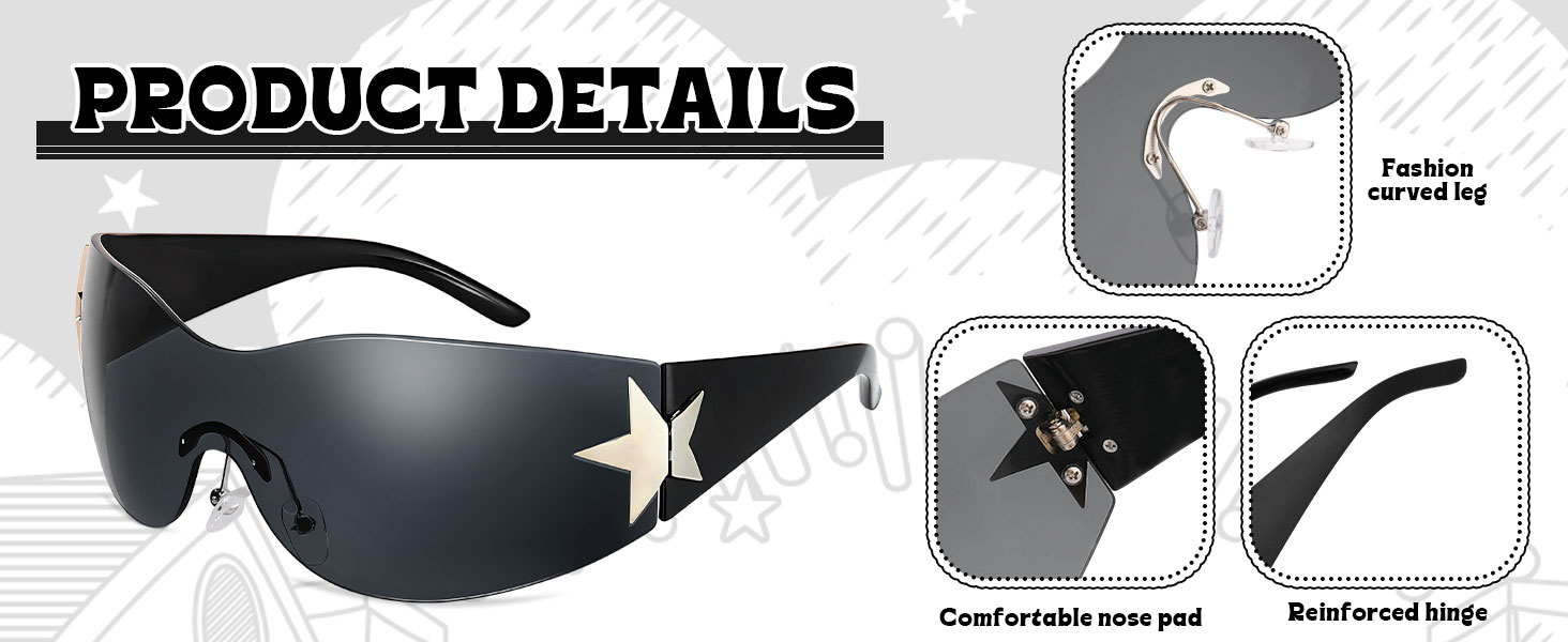 1. Sunglasses y2k is made of high-quality PC material, which is lightweight and sturdy, good flexibility, adaptable to various face shapes, and maintains a good appearance for long time use