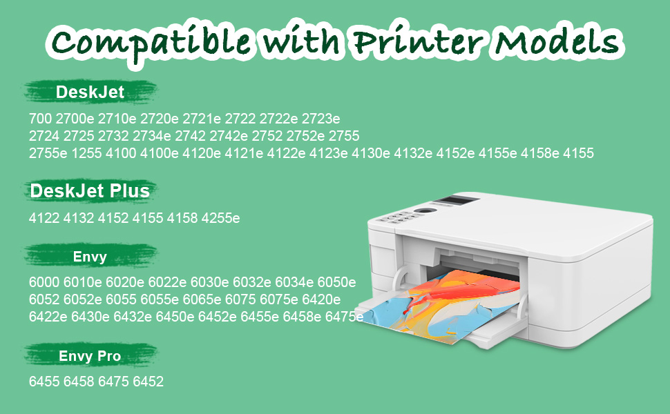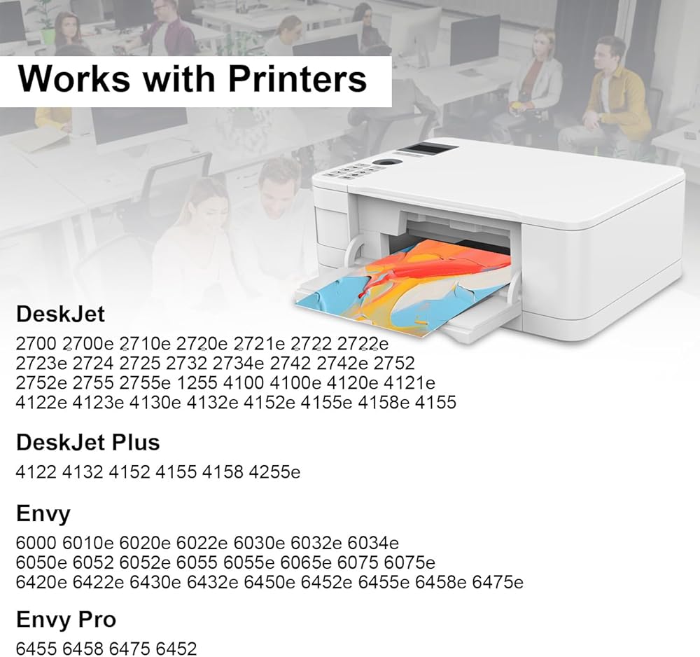 - WORK WITH: For HP Ink Cartridges 67XXL Work With DeskJet 2700 2700e 2710e 2720e 2721e 2722 2722e 2723e 2724 2725 2732 2734e 2742 2742e 2752 2752e 2755 2755e 1255 4100 4100e 4120e 4121e 4122e 4123e 4130e 4132e 4152e 4155e 4158e 4155; DeskJet Plus 4122 4132 4152 4155 4158 4255e; Envy 6000 6010e 6020e 6022e 6030e 6032e 6034e 6050e 6052 6052e 6055 6055e 6065e 6075 6075e 6420e 6422e 6430e 6432e 6450e 6452e 6455e 6458e 6475e; Envy Pro 6455 6458 6475 6452
