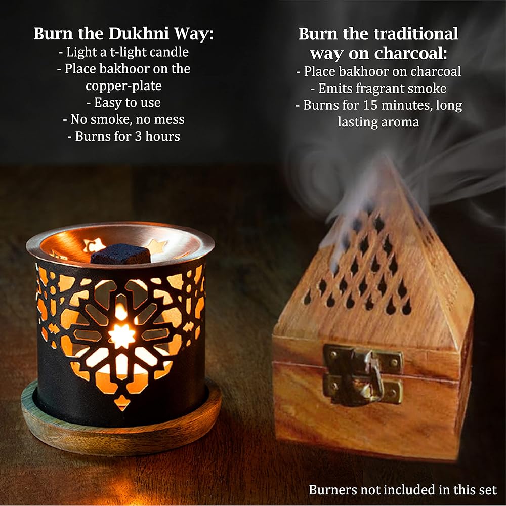 HOW TO USE: Dukhni Bakhoor can be burned the traditional way on charcoal. Place a piece of bakhoor on hot charcoal and enjoy as fragrant smoke fills up your room. It will burn for approximately 15min but the aroma will be long lasting. Our signature burners allow for a new way of burning bakhoor with ease. Simply place a piece of bakhoor on the copper plate and light the tealight below. We recommend tealight candles with a 3.5 to 4 hour burn time. The beauty of our burner is that it burns without smoke, steadily building up the flavour of the bakhoor and ensuring its longevity. In an unventilated room, the aroma of the bakhoor will spread to about 400 square feet