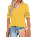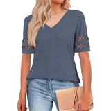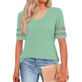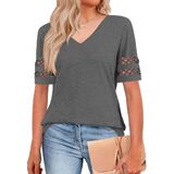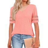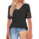 Features: This womens Casual V neck t-shirt can better trim your neck line, cute shirt has lovely lace details on the sleeves. Add a touch of elegance to your daily appearance or special occasions.,straight hem, loose fit, simple Fashion style suitable for spring and summer, a classic capsule wardrobe staple tee