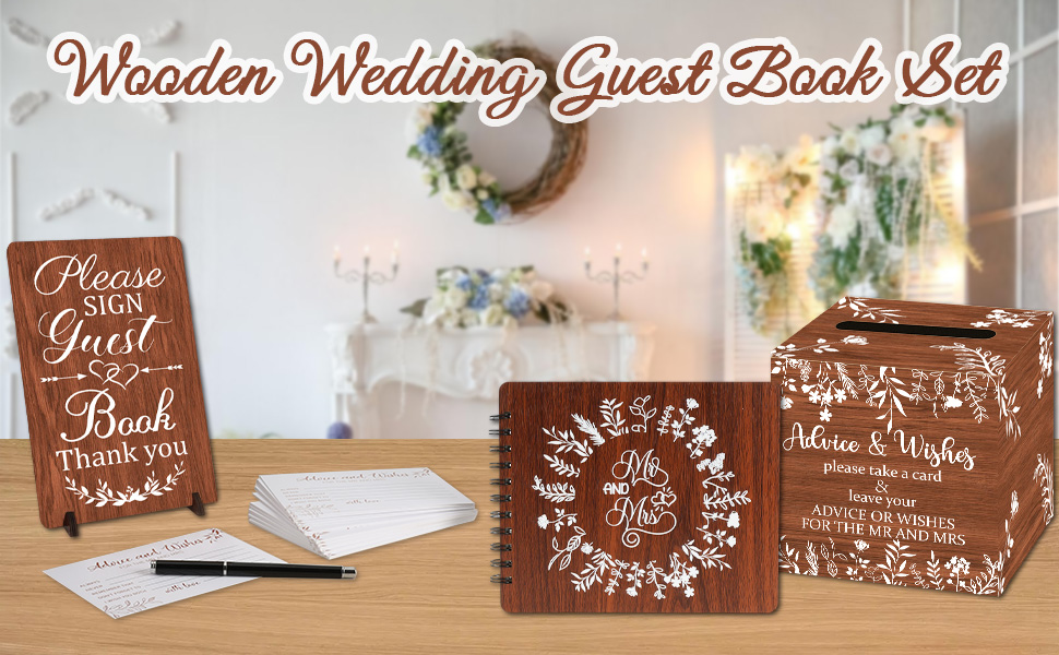 Wooden Wedding Guest Book Wedding Reception Sign in Guestbook with Pen and Holder, Table Sign,Memory Cards Box,Memory Registry Album 64 Pages for Anniversary Engagement Supplies
