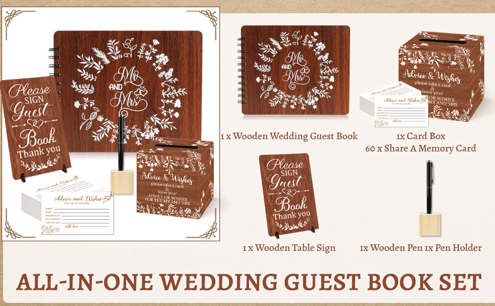 Wedding Guest Book Set: You will get 1 piece of 64 pages wedding guest book, 1 pen, 1 pen holder ,1 table sign, 60 memorial cards and 1 memory boxfor your guests' sign-in, well-wishes and souvenir storage needs, eliminating the hassle of purchasing them separately.