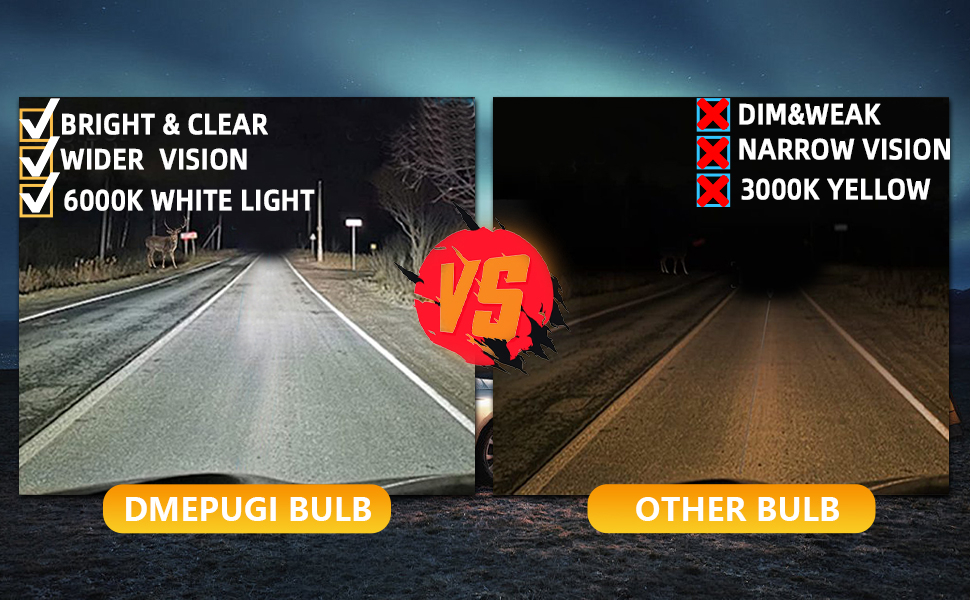 🚗【Wider Illumination Range】DMEPUGI halogen bulbs deliver 200% broader lighting than standard halogen lamps—letting you see farther and wider with no dark spots, dim areas, or glare for oncoming drivers. These high/low beam bulbs enhance driving safety, and if one burns out, we recommend replacing both headlight bulbs at the same time.