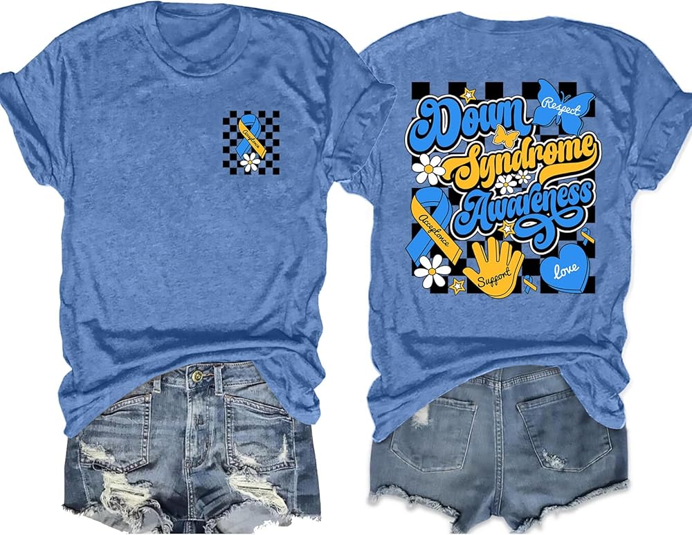 Features: This women's Down Syndrome Awareness tee has double-sided vibes: the front rocks a yellow-blue heart (those are the go-to colors for Down Syndrome awareness) plus “3-21” (that's World Down Syndrome Day, 3/21). The back? It's printed with “DOWN RIGHT PERFECT” and “DOWN SYNDROME AWARENESS” (plus cute palm graphics). It's a warm, eye-catching pick that lets you show support for the Down Syndrome community in style.