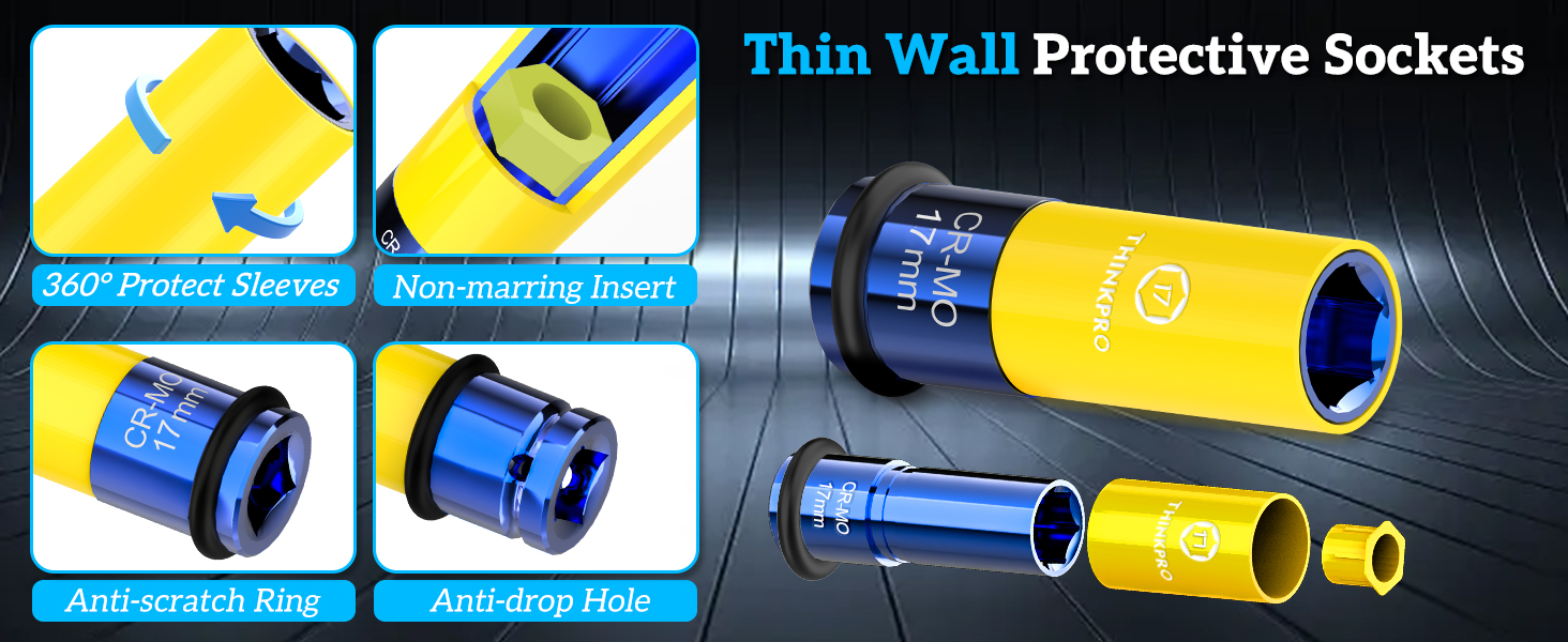 【Thin-wall socket】 The thin walls of the sleeve and removable protective cover make the l17mm socket easy to fit into tight wheelhouses and tight bolt spaces, making it suitable for a wide range of confined work situations.