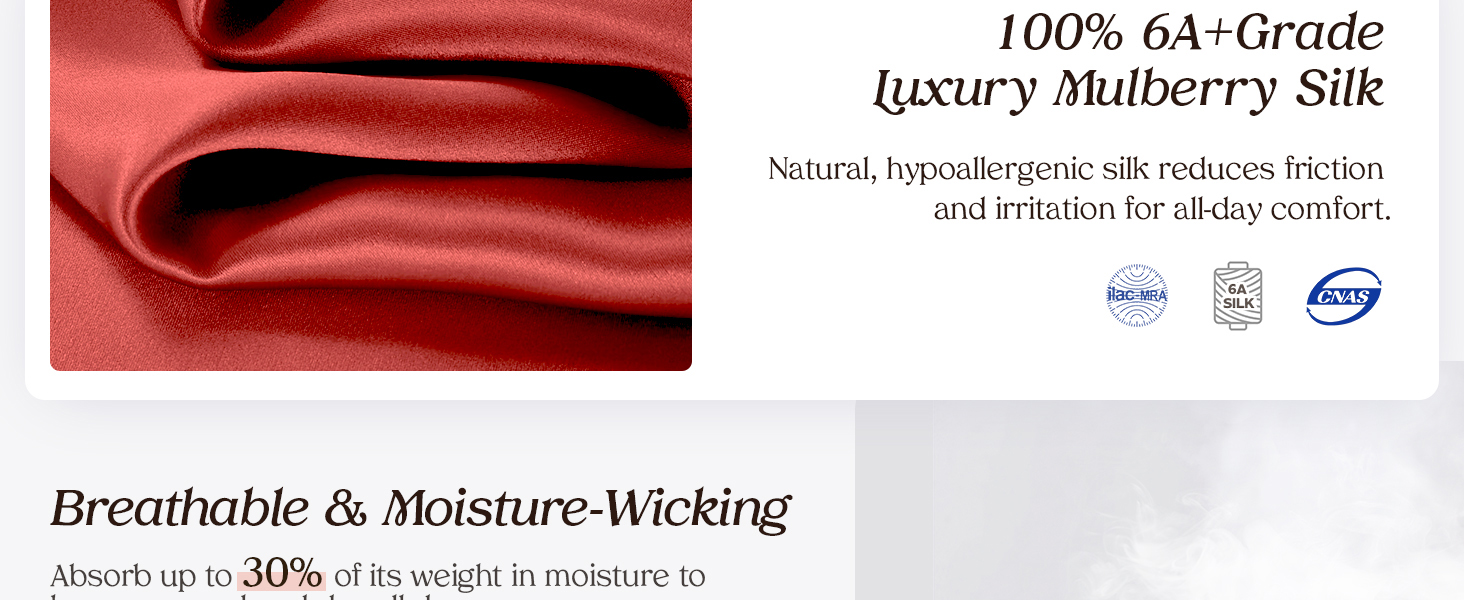 6A Grade Silk — Experience the luxury of 6A grade long-strand mulberry silk with a sleek satin finish, the same high-end quality used in premium products. This ultra-soft, smooth fabric feels like a second skin.