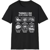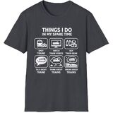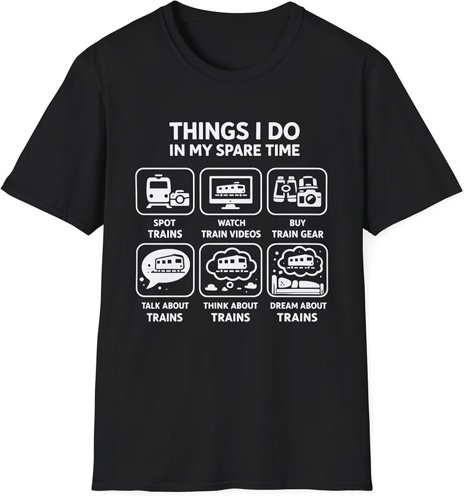If trains are your favorite hobby, this funny “Things I Do In My Spare Time” train lover shirt perfectly captures the life of a true railfan. The design humorously represents activities train lovers enjoy including train spotting, watching train videos, buying model trains, talking about locomotives, thinking about trains, and dreaming about railroads. Perfect for train lovers, railfans, train spotters, locomotive fans, and model train collectors who enjoy the world of railroads. This shirt also makes a great gift for train enthusiasts and model train hobbyists for birthdays, holidays, Christmas, or train shows. Comfortable and lightweight, this shirt is great for train spotting, railroad events, model train shows, or relaxing while working on a model train layout. Care Instructions: Wash in cold water only Air dry or tumble dry on low heat