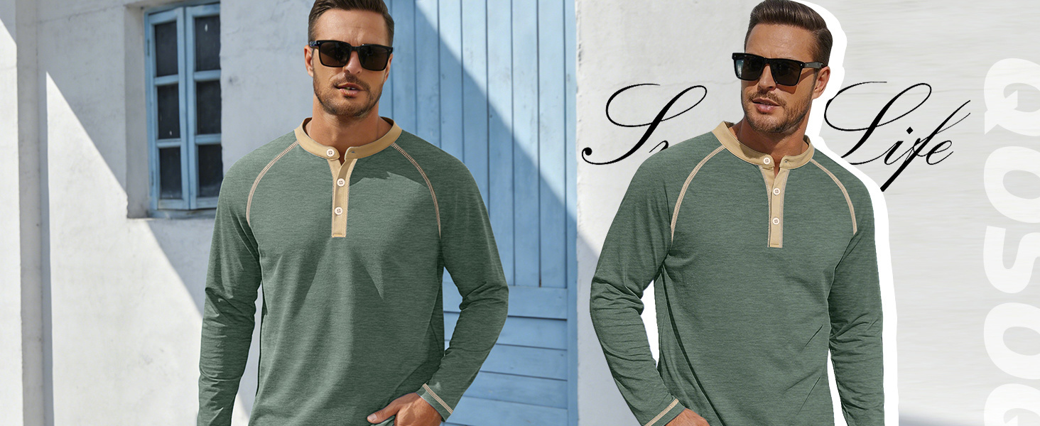 Match: Mens Henley Long Sleeve T-Shirt pairs perfectly with your favorite jeans or chinos for an easy, laid-back everyday look, or layer it under a coat, blazer, or jacket for extra warmth — an easy way to stay cozy and stylish as the temperature drops