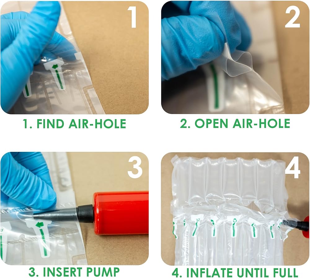Directions: Locate the inflation hole located at the collar of the bag. Green arrows show the direction of the air. Use the provided handheld air pump. Insert the air pump nozzle inside the inflation hole and blow up the bubble bags. Be careful not to over inflate as this can cause punctures.