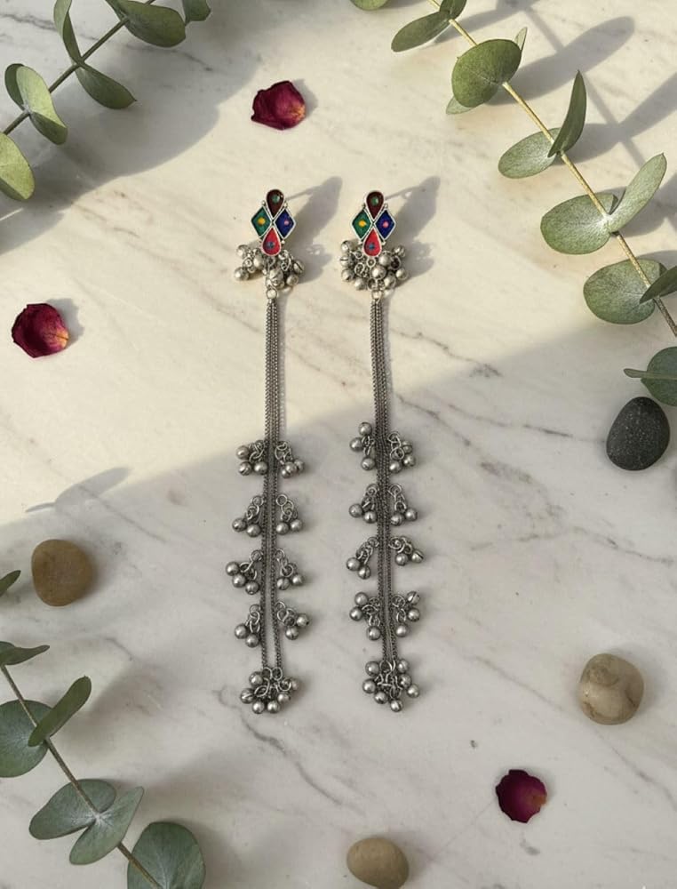 Indian Kashmiri Afghani Earrings for Women Silver Oxidised Gypsy Boho Statement Long Dangle Jhumka Jhumki Earrings Jewelry