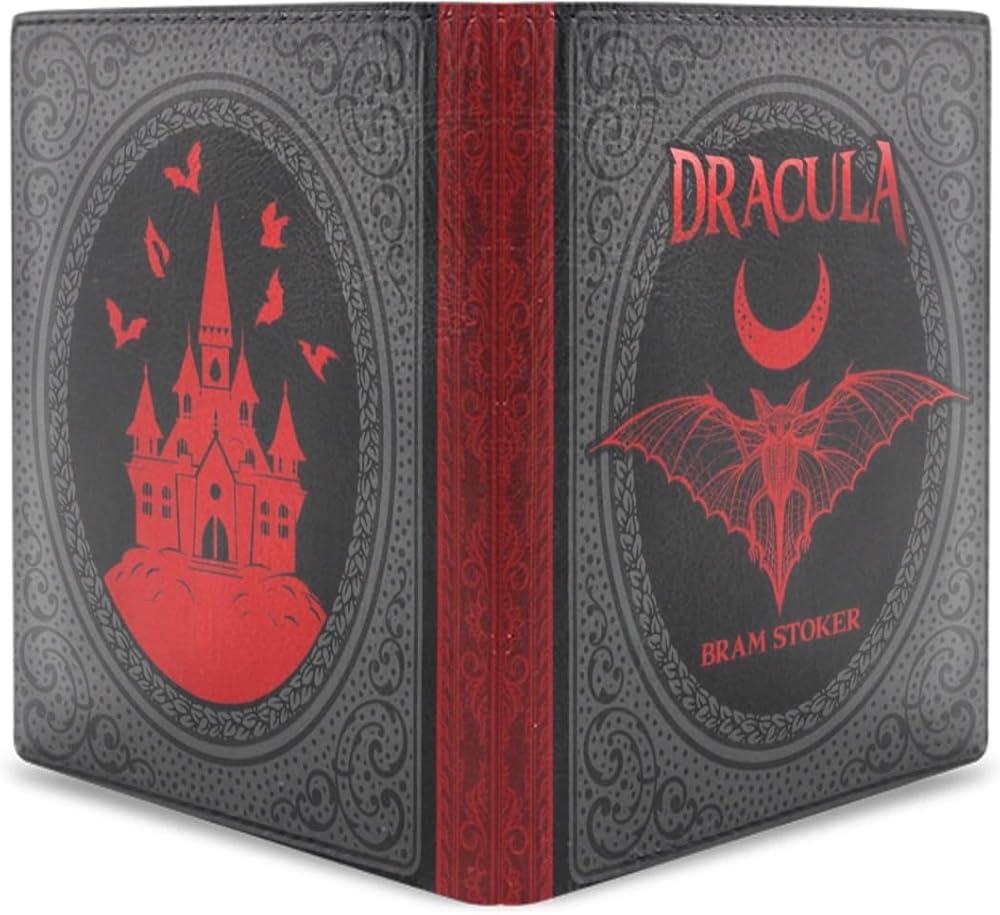 This gothic book wallet is made of vegan leather and features a dark and original book-style design inspired by Bram Stoker's Dracula. Perfect gift or accessory for any literature or horror fan. 3.77 Oz large capacity. Designed for men or women. Made from durable and luxurious vegan leather. Total 4 card slots, 1 clear window, and 2 full length pocket for cash. Expanded size: 7.87"(W) x 4.72"(H), folded size: 3.93"(W) x 4.72"(H).