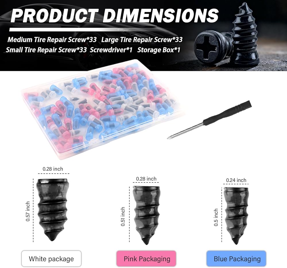 Packaging: 30* Large Tire Plugs + 30* Medium Tire Plugs + 40* Small Tire Plugs + 1* Screwdriver + 1* Storage Case