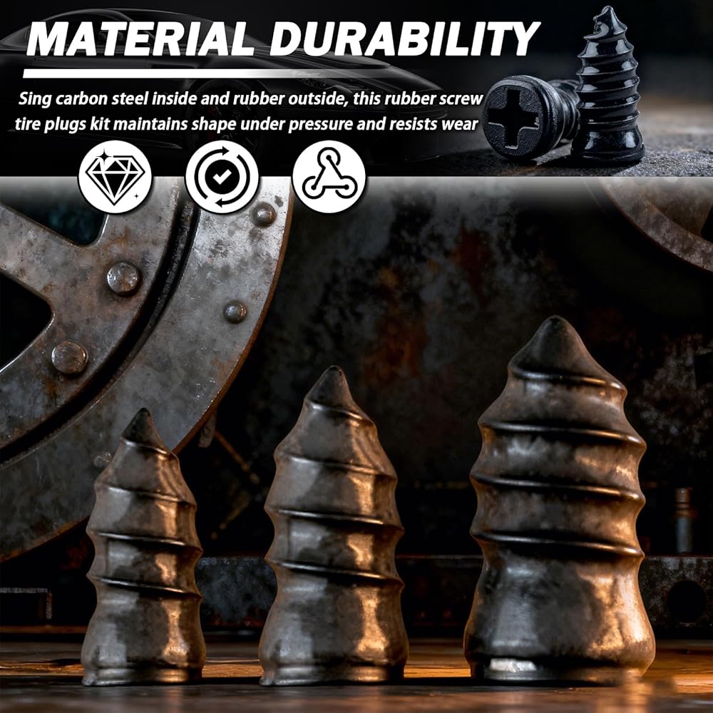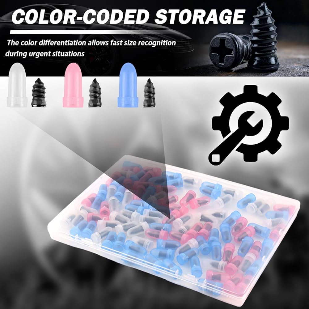 1. This kit contains 100 pieces with 3 plug sizes, a screwdriver, and a storage case, offering a direct solution for immediate tire repairs when sharp objects cause air loss. The outer threading and rubber coating provide a close fitting with tire breaks, enabling rapid fixes without tire detach