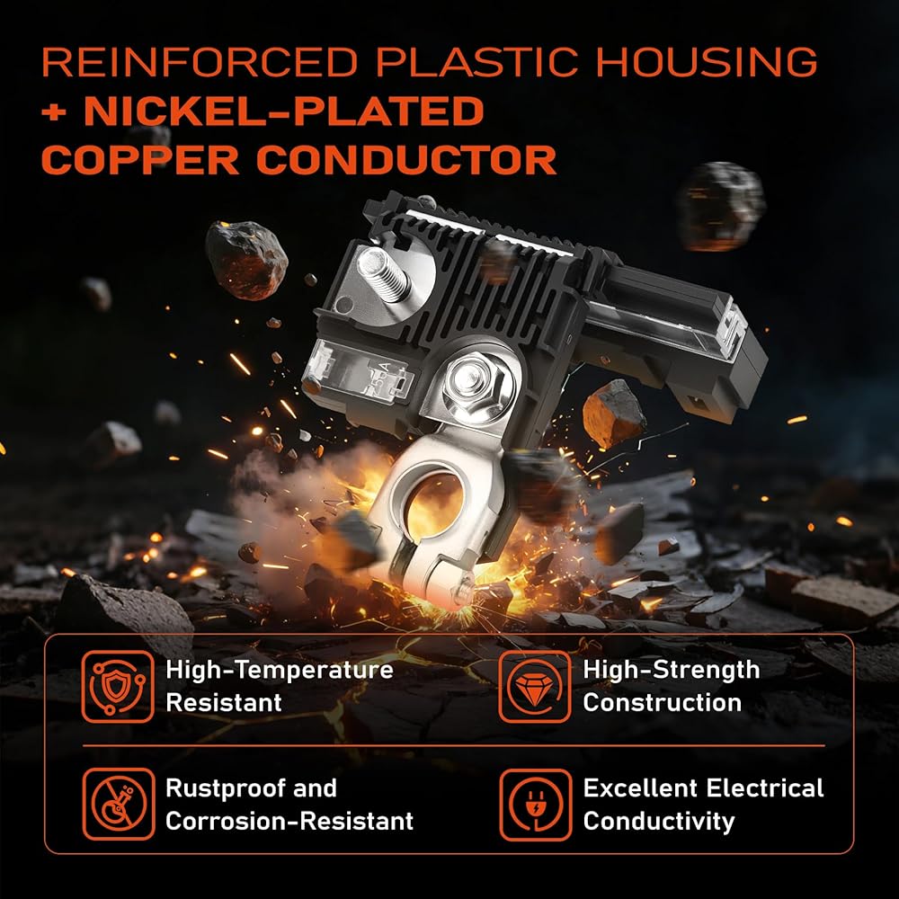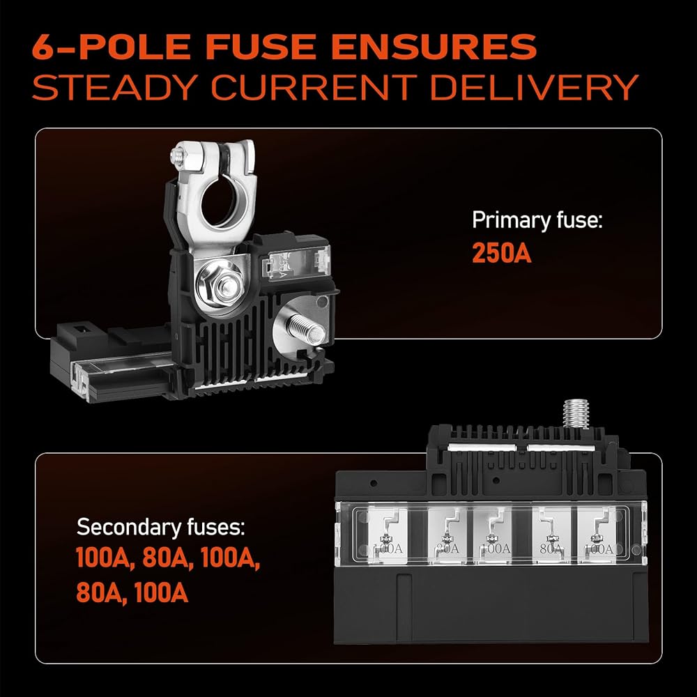 Integrated Terminal Design: The integrated multi-functional circuit interface integrates the battery positive terminal and fuse into the same component, adopting a 6-pole layout design, and is equipped with 5 auxiliary fuses of different specifications (including 100 Amp, 80 Amp, 100 Amp, 80 Amp, and 100 Amp), which can realize the direct connection between the battery and the circuit, and can simultaneously protect multiple electrical devices