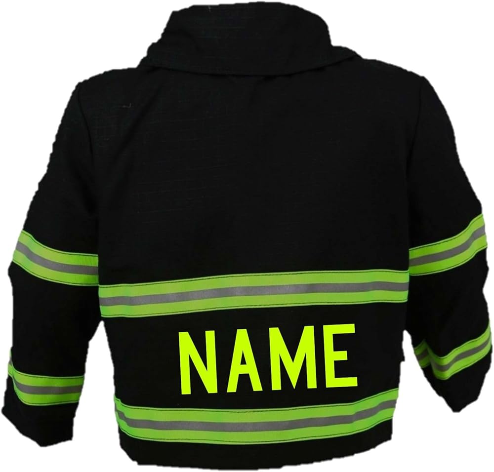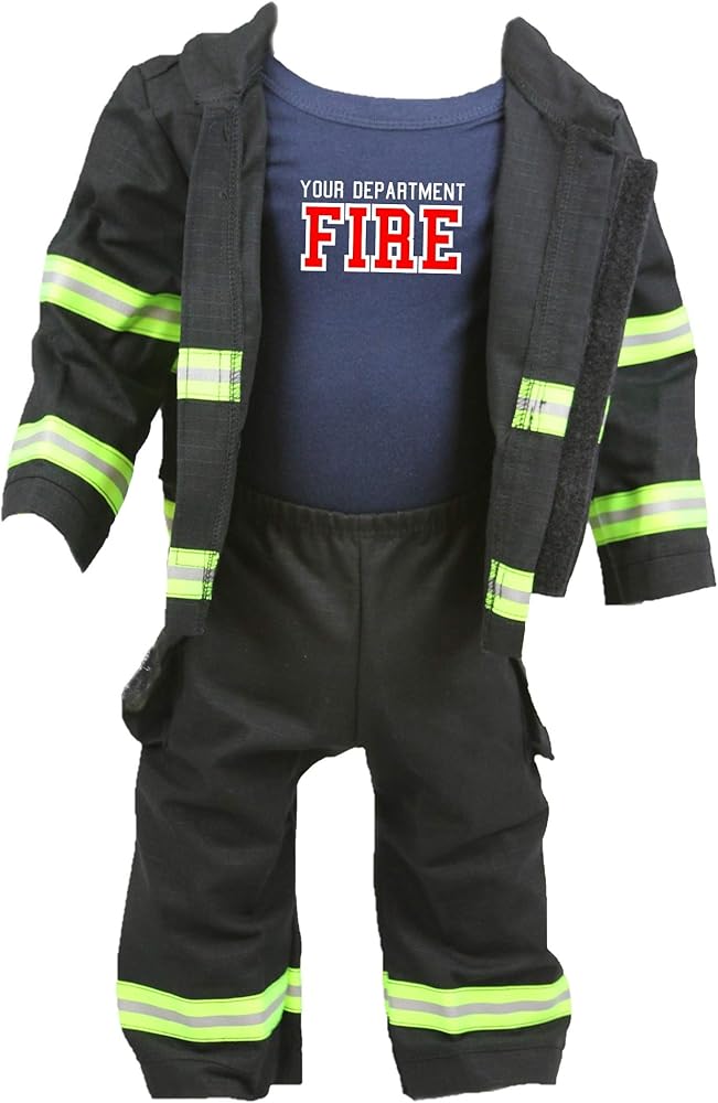 Set: This includes a bodysuit, jacket, and a pair of pants. Materials: 100% cotton navy blue shirt. Cotton-Poly Pants/Jacket. Personalization: Bodysuit features vinyl suspenders and is personalized with the desired Fire Department name above "Fire" on the front. The jacket is personalized with the name of your choice on the back! Names are Professionally Thermal Bonded for durability. Returns/Exchanges: Because this item is personalized, it cannot be returned or exchanged. If there is a problem with your order please contact me.