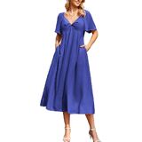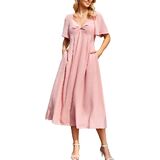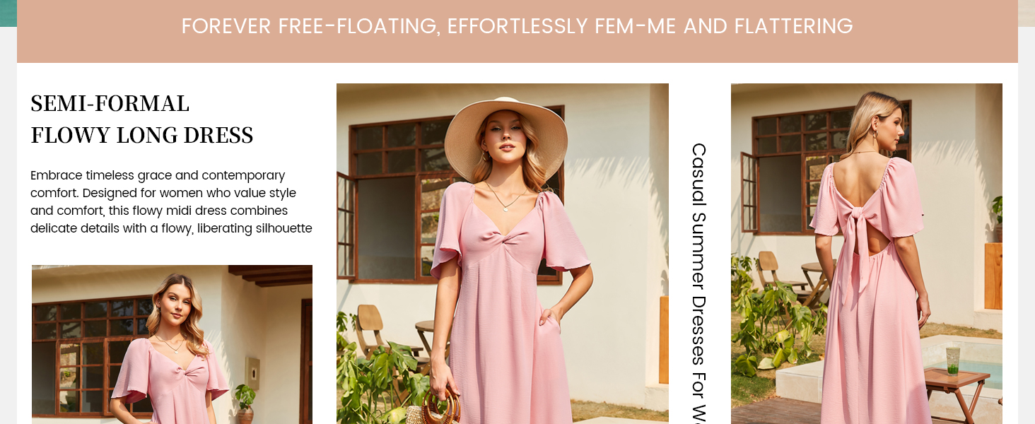 [Design Concept]: Forever free-floating, effortlessly fem-me and flattering. The long dress for women is featured in a V-neck, backless, side pockets, adjustable back tie, back half elastic waist, soft faux linen fabric, twist knot sweetheart neckline with butterfly short sleeves for added shape, effortless pull-on style