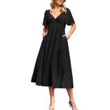 [Size Guide]: Small=US 4-6, Medium=US 8-10, Large=US 12-14, X-Large=US 16. Please refer to the "Size Chart" on the product page before ordering Kikibell Twist Knot Neckline V Neck Back Tie Flowy Midi Dress to ensure a perfect fit