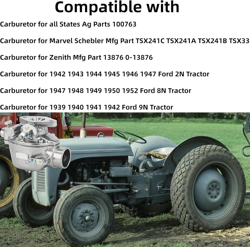 Compatible with: TSX33 Carburetor for 1942 1943 1944 1945 1946 1947 Ford 2N Tractor, 1947 1948 1949 1950 1952 Ford 8N Tractor, 1939 1940 1941 1942 Ford 9N Tractor. Don't fit overhead valve engines or ferguson engines