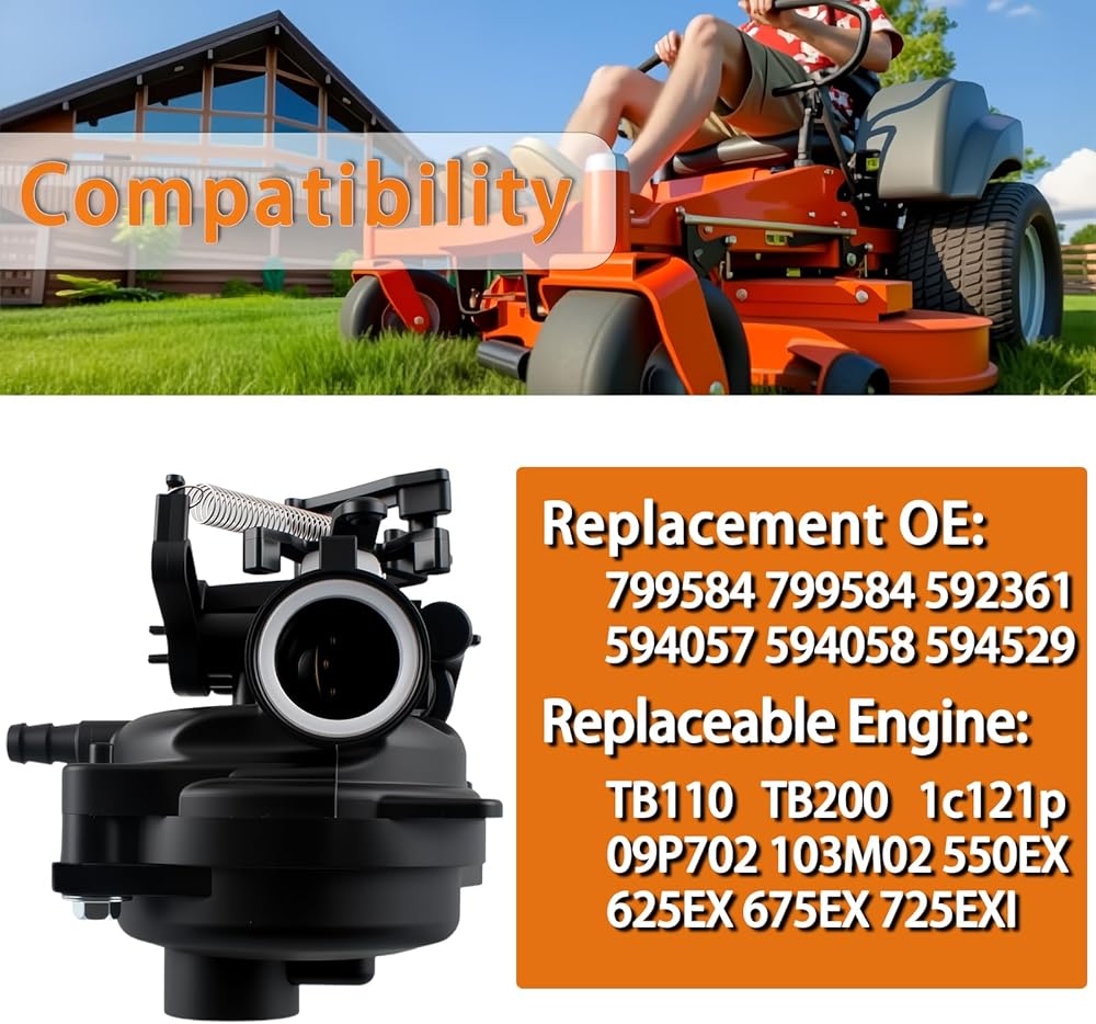Fit for Various Lawn Mower Models: This carburetor is suitable for Husqvarna LC 121P push lawnmower, Toro 550ex 140cc mower, Yard Machines 675EX Snapper Mower, Troy B110 lawn mower, Troy-Bilt TB110, and 247372370 Craftman, providing broad usability