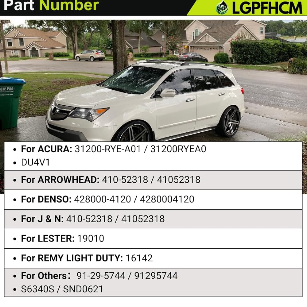 - Part Number: For ACURA: 31200-RYE-A01 / 31200RYEA01 / DU4V1 / For ARROWHEAD: 410-52318 / 41052318 / For DENSO: 428000-4120 / 4280004120 / For J & N: 410-52318 / 41052318 / For LESTER: 19010 / For REMY LIGHT DUTY: 16142 / For Others:91-29-5744 / 91295744 / S6340S / SND0621