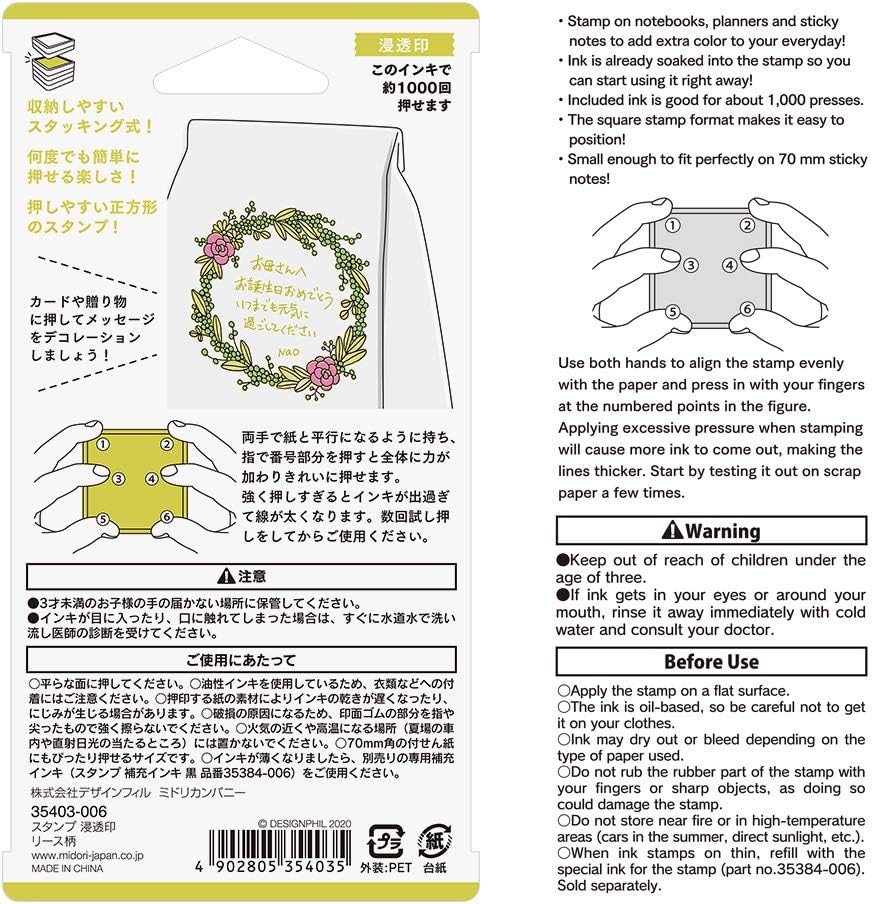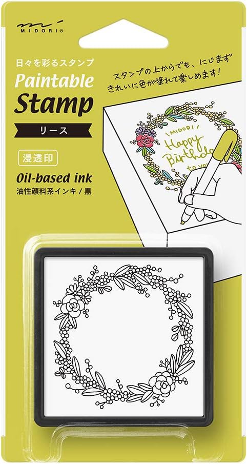 It is a penetrating stamp type stamp that allows you to press fine patterns neatly, paint from above, and write records and messages. Stacking type that can be stacked and stored. It is an easy-to-press square and can be pressed about 1,000 times. Since it is an oil-based ink, it will not bleed even if you paint it with a water-based marker on the stamp you pressed. You can enjoy the decoration by pressing it on your notebook, diary, or sticky note and coloring it to your liking. Press the "Wreath pattern" on a card or gift to decorate your message. Attention 〇 At the beginning of use, the ink is full to the capacity, so it is easy for a lot of ink to come out when pressed on paper. Therefore, paper strike through may occur. Also, if you press it strongly or for a long time, a lot of ink will come out and it may cause strike-through. Be sure to press it before use. 〇 Please push it on a flat surface. 〇Because oil-based ink is used, please be careful not to adhere it to clothing. 〇 Depending on the material of the paper to be stamped, the ink may dry slowly or bleeding may occur. 〇 Do not rub the rubber part of the stamp surface strongly with your finger or a sharp object as it may cause damage. 〇 Do not place near fire or in places with high temperatures (in the car in summer or in direct sunlight). 〇 It is a size that can be pressed perfectly on 70 mm square sticky notes. 〇 You can press it about 1,000 times with this ink.
