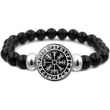 Viking-Inspired Design: Showcases a central circular Viking Viking rune charm surrounded by sleek black beads, blending ancient Nordic symbolism with contemporary style for a striking accessory.